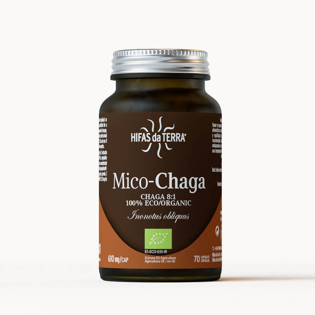 Mico-Chaga es el complemento alimenticio de cápsulas vegetales con extracto puro y ecológico de la perla del norte, Chaga (Inonotus obliquus). Contiene vitamina C proveniente de la acerola que protege del daño oxidativo.