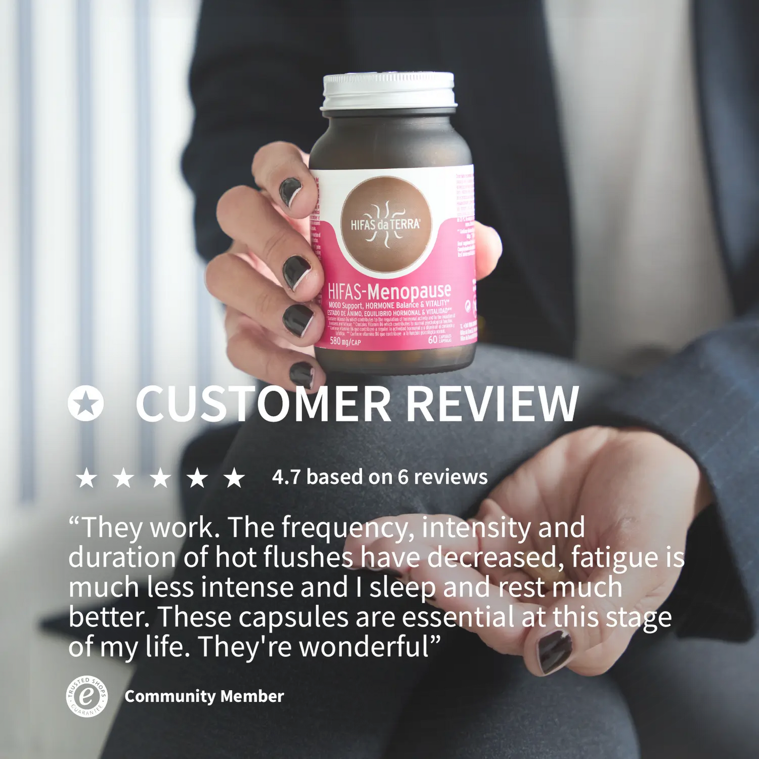 Hifas-Menopause stands out among menopause supplements with a formula based on Adaptogenic fungal extracts, Ashwagandha KSM-66 and green tea (with 95% polyphenols). Its natural composition helps in the hormonal balance, mood and vitality.