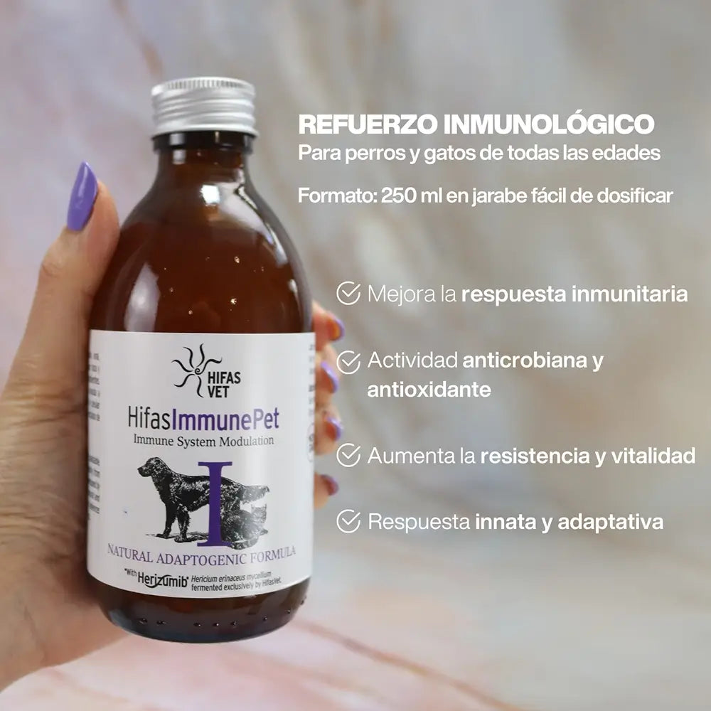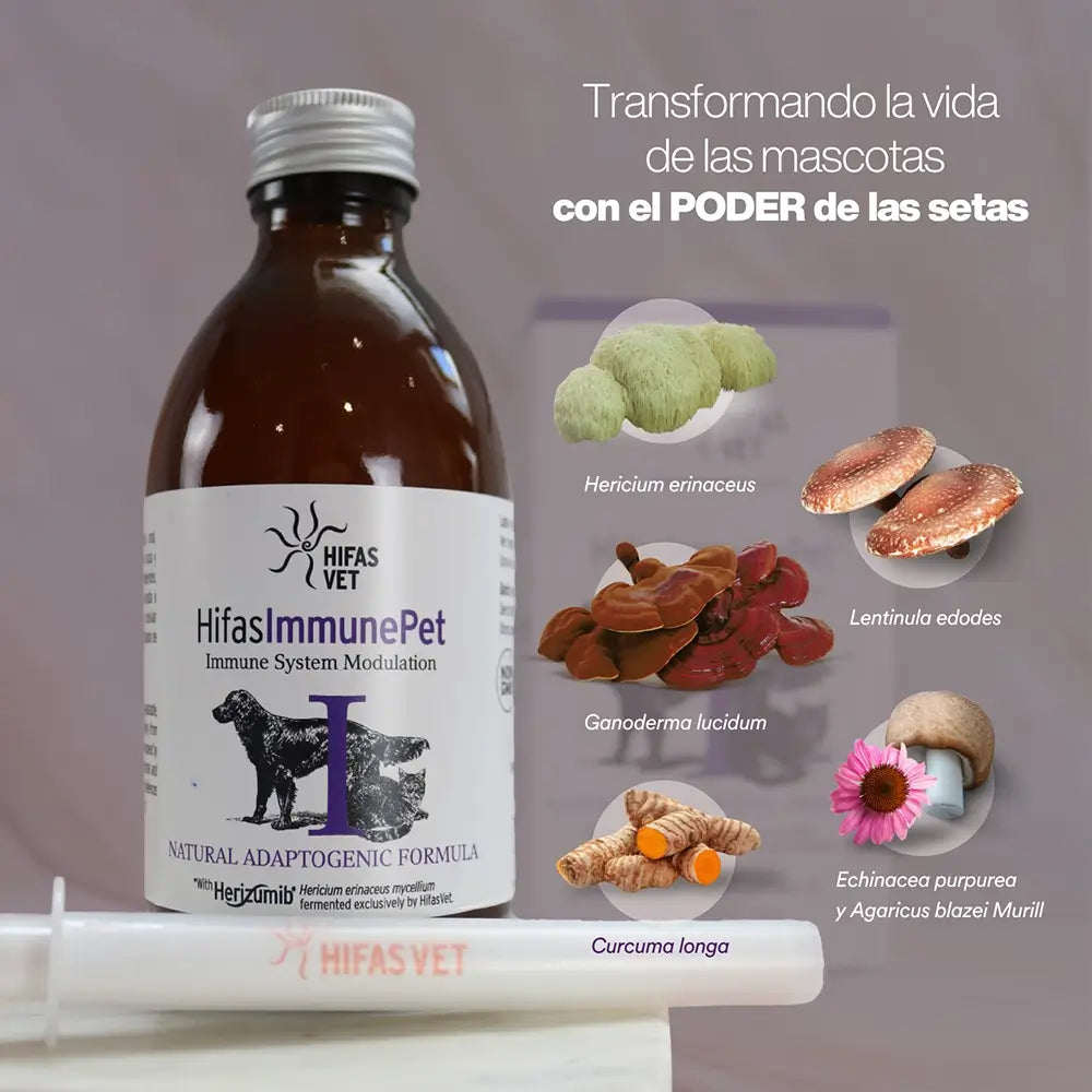 The fungi used in this formula contain naturally occurring bioactive compounds that form part of a functional diet. They provide nutrients that strengthen pets' immune systems and help protect their defences, increasing their resistance and vitality. Including them in the diet can contribute to the general well-being and physiological balance of dogs and cats. - Improves humoral and cellular immune response in puppies and young animals before and after vaccination, strengthening the vaccine response and seroconversion. - Has immunomodulatory activity, stimulating defence mechanisms and innate and adaptive (humoral and cellular) responses. - Can be used as an adjuvant in animals with conditions that require continuous nutritional support. - Recommended as a dietary supplement for animals undergoing surgery, veterinary treatment or conditions that alter their normal physiological state.